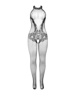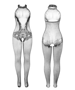 - Style: Black fishnet and lace bodystocking with a high neck and crotchless design.