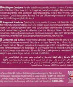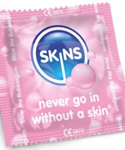 4-Pack of Skins Bubblegum Blow Me! Condoms Give them a touch of excitement with the tempting fruity bubblegum scent. The high-quality latex is infused with the scent of bubblegum, for a long-lasting, delicious aroma that adds a whole new sensation to sex. Skins condoms are stronger, thinner, and more lubricated than most. This means they feel like a second skin and are less likely to break. Skins are not only the best for sensation and pleasure, but also one of the safest condoms on the market.
