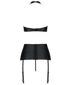 Il set Nancy è un set di tre pezzi di Passion, che include un top allacciato al collo, reggicalze e perizoma dal taglio audace. Tutto questo è realizzato in pelle nera, decorata con numerose strisce incrociate che rivelano qualità femminili.