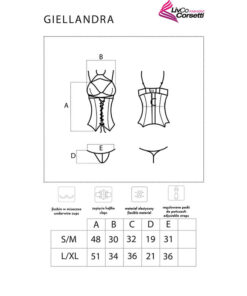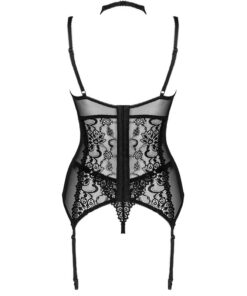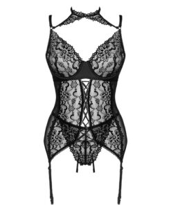 The Giellandra corset for the senses is a set of the luxurious Polish brand LivCo Corsetti Fashion, consisting of 2 elements – a corset and a thong. The underwear is in a classic black color. The corset is fastened with hooks, which allows adjustment and guarantees comfort. It is also possible to adjust the length of the straps and attach stockings, which will greatly diversify the styling. This is a perfect proposition for women who value comfort, but do not want to give up a sensual appearance. The underwear is made of 90% polyamide and 10% elastane. This combination of materials makes the outfit very flexible and does not restrict movement. The set includes decorative inserts made of durable lace that emphasize feminine shapes in all the most important places. The cut and binding on the belly make the corset sophisticated and at the same time leave room for imagination. An unusual element is a choker that will draw attention to the neck and collarbones. This sexy corset will certainly spice up many romantic evenings.