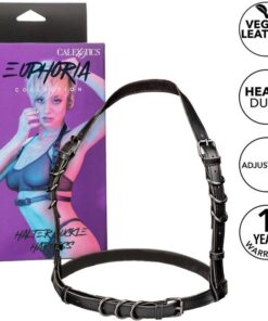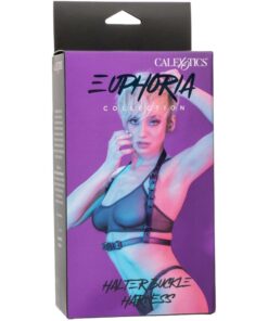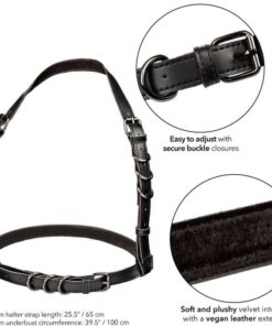 Explore with the Halter Buckle Harness from the Euphoria Collection: an elegant, comfortable and functional accessory that captivates with a halter-style design. Accentuating curves and turning heads, its perfect for intimate moments or bold festival outfits. The secure buckle closure ensures easy adjustment for a custom fit, adapting to your preferred fit. Durable and contemporary, it stands up to intense play. Enjoy the fluffy velvet interior and elevate your appeal with the vegan leather exterior. The sturdy construction, non-tarnish metal accents, and adjustable size make it reliable and visually appealing. Experience the perfect combination of style and sensuality with this versatile and captivating harness.