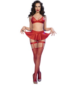 The set is completed with a short, flared skirt that accentuates the waist and adds a playful touch. It also includes matching thong panties, garter straps, and stockings, creating a fully sensual and alluring look. Ideal for special occasions that call for a daring and captivating outfit.