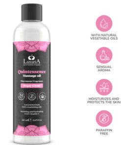 – Paraffin-free and dye-free. Quintessence Massage Oil does not contain paraffin or dyes, allowing you to fully enjoy every moment of pleasure in complete safety. Its formula has been designed to glide smoothly over your skin, keeping it always safe and free of discomfort.