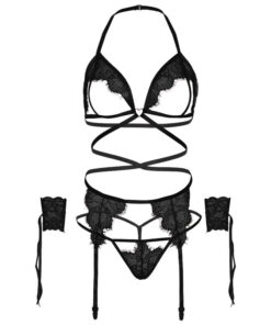 4 pieces set. Eyelash lace cage strap open cup bra with heart ring accent, garter belt, g-string panty and wrist cuffs by the prestigious lingerie brand, Leg Avenue. Increase your feminity getting an exclusive piece of seduction sensuality and elegance.