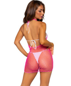 The halter neck twisted fishnet mini dress is a bold and sophisticated fashion piece that combines classic elements with contemporary details. This dress is distinguished by its innovative design and its ability to highlight the silhouette of the wearer.