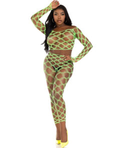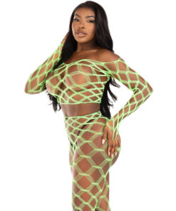 The 2-piece hardcore fishnet crop top with footless stockings is the perfect option for a special night or to surprise your partner. Its bold and seductive design will make you fall in love. You will feel confident and powerful, while its softness and elasticity will keep you comfortable and ready for any intimate occasion. It is the ideal choice for those who want to express their sensuality and style with confidence and boldness.