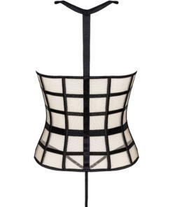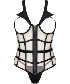 A two-piece set consisting of a sensual, busty corset and a sexy black thong. The corset has a zipper at the front, making it easy to put on. The colors of the set are black and beige, which together create an attractive combination. It is also worth paying attention to tempting details such as a black collar or black belts arranged in such a way as to best highlight the waist. What stands out most about this corset are the cutouts that expose the bust. This makes the whole set very daring and provocative. Not much is left to the imagination. Nipple stickers will be a great addition to the game and add some spice.