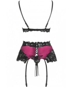 A gorgeous and seductive lingerie set with an elegant cut, made from an exceptionally delicate burgundy satin and exquisite lace in a deep black tone. Satin bra with thin, adjustable straps decorated with lace. The decorative garter belt, sensually tied with a black ribbon at the back, is also a combination of satin and lace, and includes a thong.