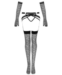 - Stockings: The stockings, also in fishnet fabric, adhere gently to the legs, providing a sexy and elegant look. The combination with the garter belt creates a cohesive and seductive appearance.