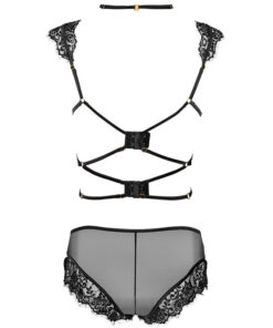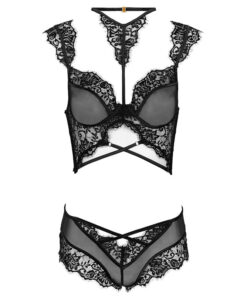 The black Palmenom set consists of two parts: a bra and panties. These two elements combined in one set look amazing and anyone who sees a woman in this set will fall to their knees. The underwear has a lace finish and its additional advantage are the straps around the torso. In areas where there is no black lace, there is a seductive, transparent black material. The Palmenom set will make every woman who wears it feel special. It’s perfect to wear on a romantic evening for two, to celebrate a special occasion when you want to surprise your loved one or just to add a bit of spice.