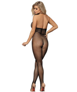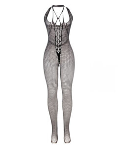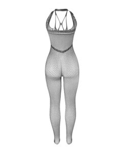 - Style: Long black fishnet bodystocking with straps on the chest and back.