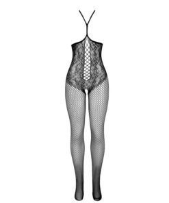 - Style: Black fishnet bodysuit with open chest and halter neck design.